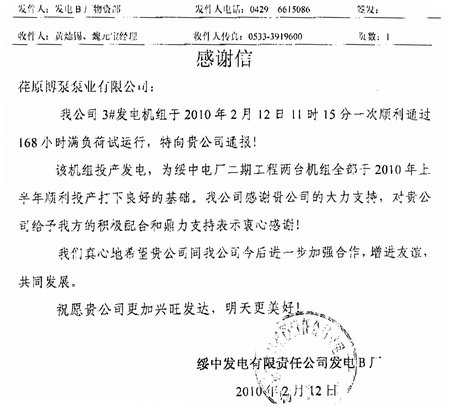 日前,綏中發(fā)電有限責任公司發(fā)電B廠發(fā)來感謝信,通報了我公司供貨的2000VZNM型立式循環(huán)水泵順利通過168小時滿負荷試運行, 順利發(fā)電。綏中發(fā)電有限責任公司發(fā)電B廠,為2X1000MW超